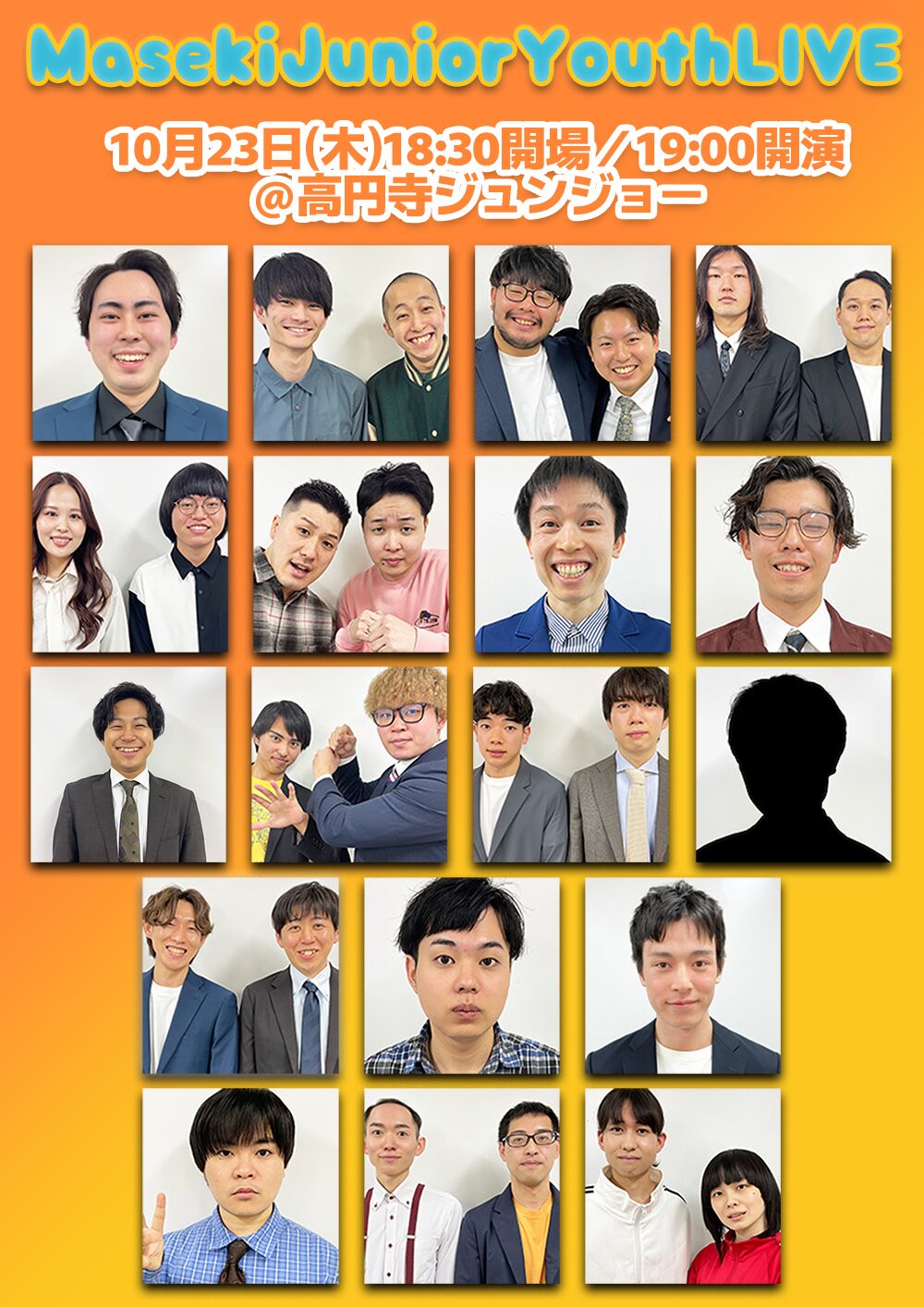 マセキタレントゼミナール卒業生たちが集結!ネタとトークで盛り上がる注目ライブ「マセキジュニアユースライブ」が、高円寺ジュンジョーで開催されます。MCは“もめんと”。個性豊かな若手芸人たちによるフレッシュな笑いを間近で体感できる夜です。チケットは前売・当日ともに1,500円、整理番号付き自由席でのご案内。秋の高円寺で、新世代お笑いのエネルギーをたっぷり楽しもう!